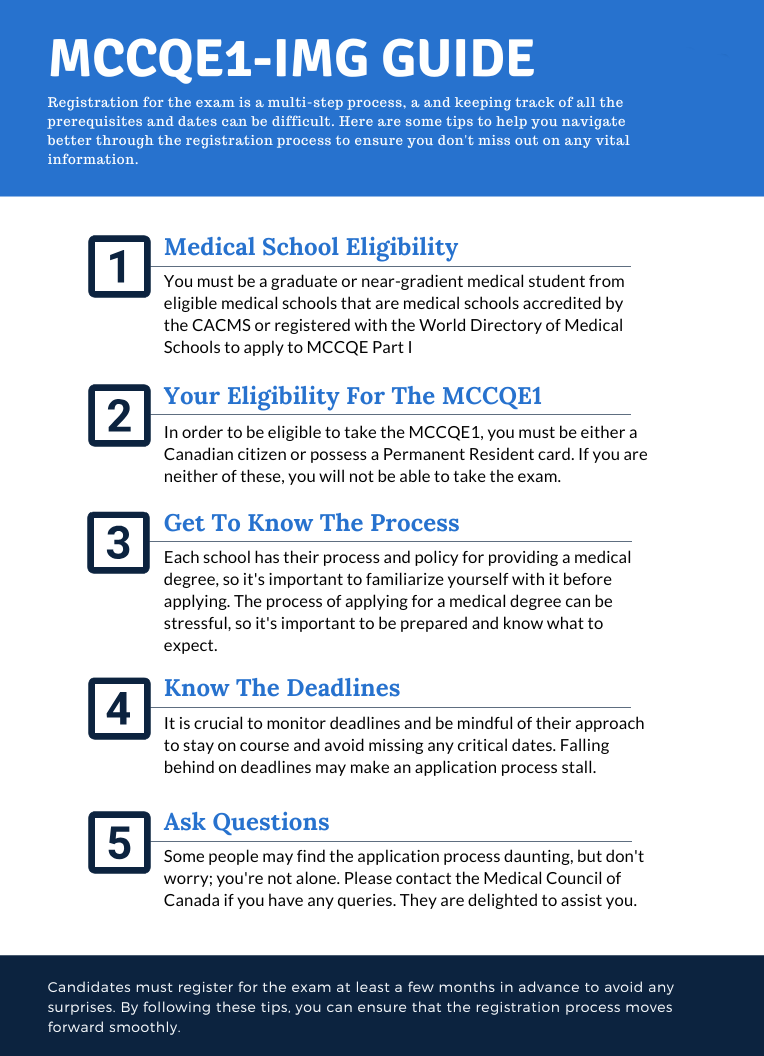 The MCCQE1 exam registration process is not difficult, and most candidates register for the exam online. However, it is better to start registering for the exam at least a few months in advance to avoid any surprises in the process, particularly if you are a non-Canadian international medical graduate (IMG) from a commonwealth country or in the immigration process.