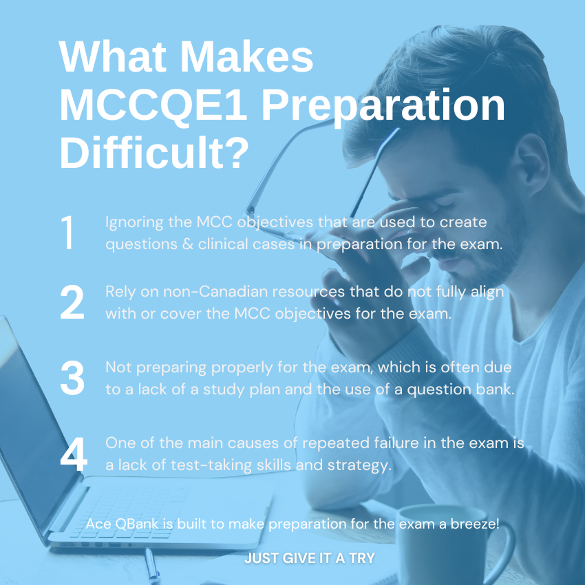 The third factor is not studying enough for the exam. The MCCQE1 covers a wide range of topics from various medical disciplines, including internal medicine, obstetrics and gynecology, emergency medicine, pediatrics, medical ethics, and preventive medicine. This requires applicants to have a deep understanding of the material and the ability to draw connections between different MCC objectives.