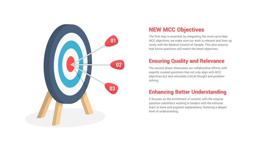 The first phase of this collaborative process is the incorporation of the latest MCC objectives. This is a vital step, establishing the foundation upon which new questions are built. These objectives guide the direction of the questions, ensuring they reflect the most current, relevant information in the field. In this phase, experts painstakingly review and incorporate these objectives, laying the groundwork for the creation of new, challenging questions.