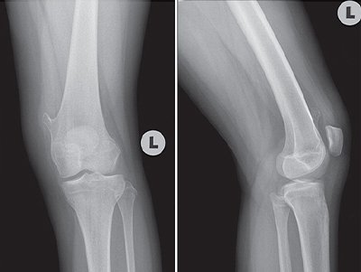 01 Nov Lump in leg By arsalan0 Comments An 11-year-old girl, a student, accompanied by her mother, came to the clinic complaining of a lump in her left leg that did not go away. She noticed the pump 15 days ago; it has not grown and is not associated with pain. She had no trauma or injury to the left leg, and the lump does not interfere with her daily activities. Her family history is unremarkable. Her physical examination revealed a lump on her left medial knee, skin over lump was normal, no ecchymosis. The lump is nontender firm, fixed bony prominence, and located on the medial distal left femur. However, there was no knee joint effusion and her knee range of motion was normal. No palpable inguinal lymphadenopathy was noticed. Plain radiography was performed and is shown below. Based on the physical examination and radiography findings, Which one of the following is the most likely diagnosis? Osteochondroma Osteoid osteoma Enchondroma Non-ossifying fibroma Fibrous dysplasia None Time's up Share article:TwitterFacebookLinkedin